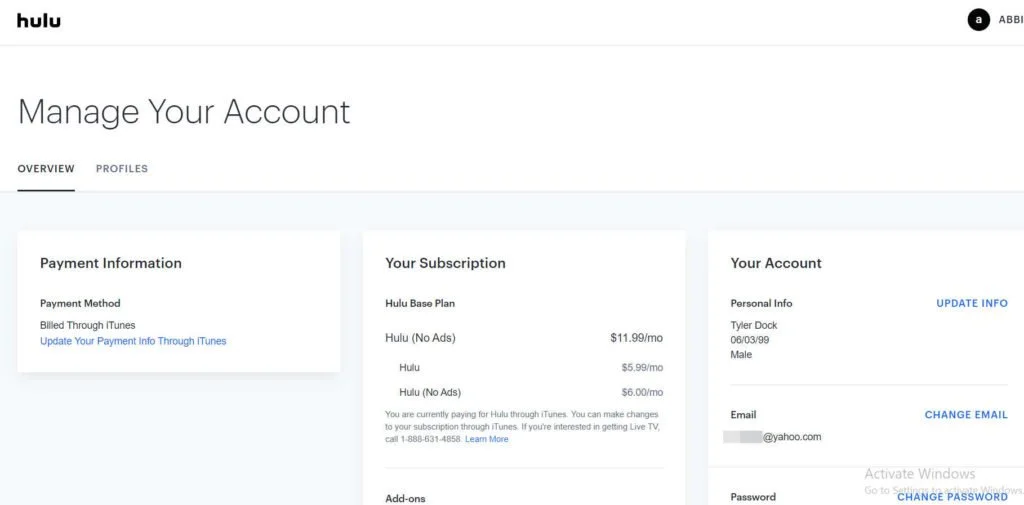 Removing tabs at the top and leaving only Account Overview, Billing & Payments, Profile