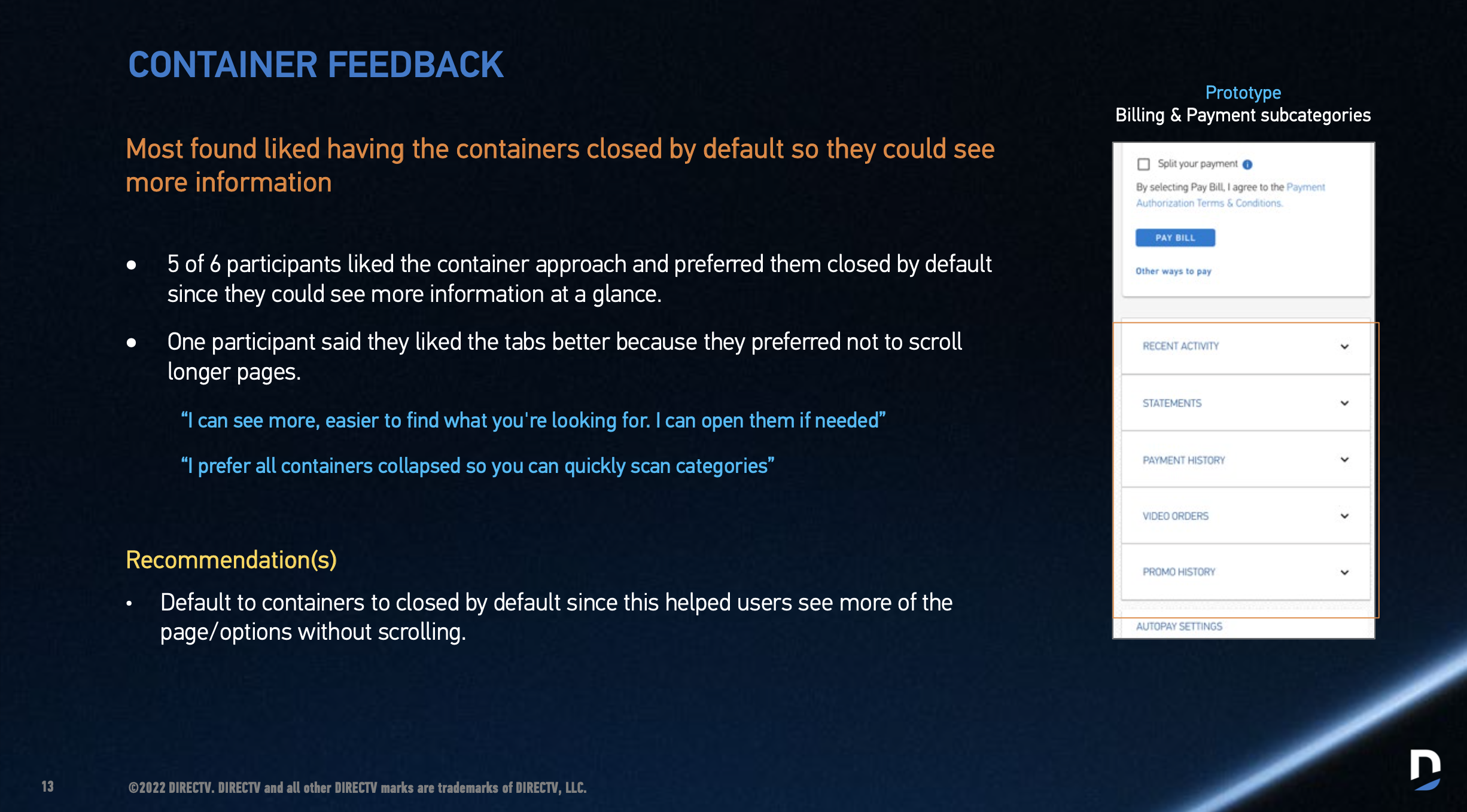 Why: We conducted this study to find out if users preferred a container-based navigation design (vs. tabs) and whether they visioned it as a benefit/improvement over current production
